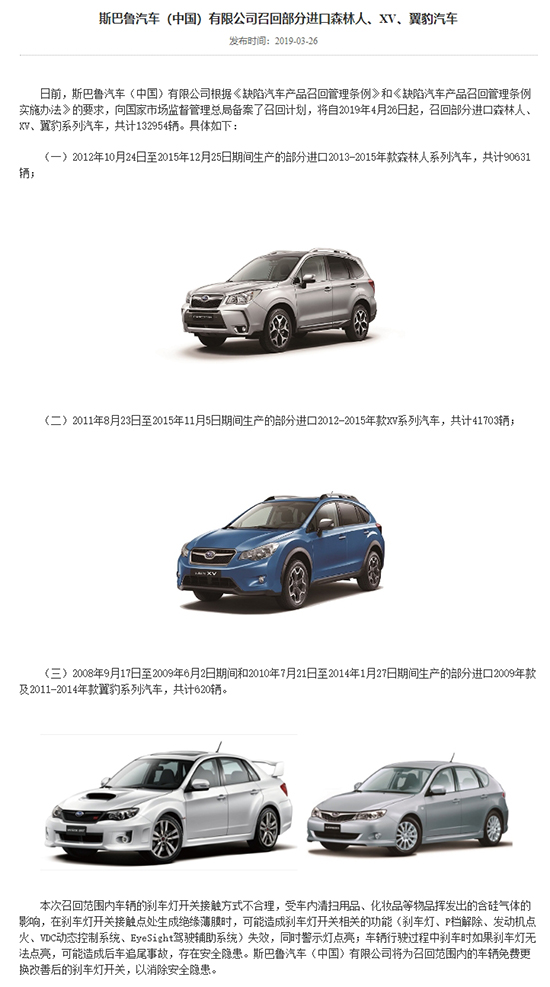 從召回原因來(lái)看,本月斯巴魯涉及132954輛汽車的召回不僅數(shù)量最大,召回原因也頗具“創(chuàng)意”。該批車輛因剎車燈開關(guān)接觸方式不合理,受車內(nèi)清掃用品、化妝品等物品揮發(fā)出的含硅氣體的影響,在剎車燈開關(guān)接觸點(diǎn)處生成絕緣薄膜時(shí),可能造成剎車燈開關(guān)相關(guān)的功能(剎車燈、P檔解除、發(fā)動(dòng)機(jī)點(diǎn)火、VDC動(dòng)態(tài)控制系統(tǒng)、EyeSight駕駛輔助系統(tǒng))失效,同時(shí)警示燈點(diǎn)亮;車輛行駛過程中剎車時(shí)如果剎車燈無(wú)法點(diǎn)亮,可能造成后車追尾事故,存在安全隱患。