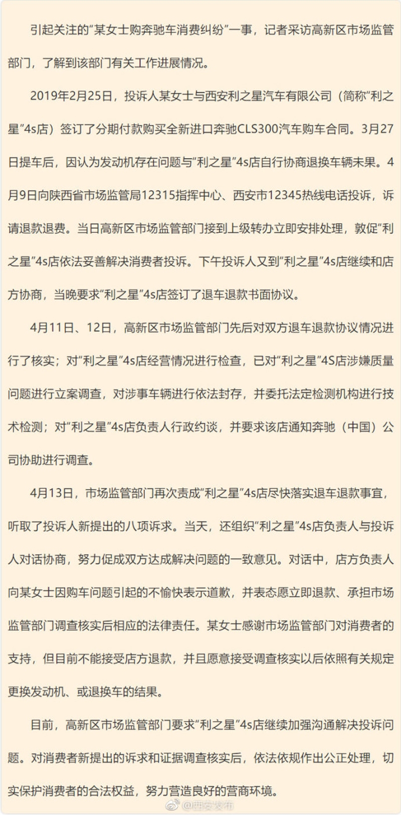 據(jù)西安市互聯(lián)網(wǎng)信息辦公室官方微博消息稱(chēng),4月13日,高新區(qū)市場(chǎng)監(jiān)管部門(mén)曾組織利之星4S店負(fù)責(zé)人與投訴人進(jìn)行對(duì)話協(xié)商。對(duì)話中,店方負(fù)責(zé)人向奔馳女車(chē)主因購(gòu)車(chē)問(wèn)題引起的不愉快表示道歉,并表態(tài)愿立即退款、承擔(dān)市場(chǎng)監(jiān)管部門(mén)調(diào)查核實(shí)后相應(yīng)的法律責(zé)任。該奔馳女車(chē)主感謝市場(chǎng)監(jiān)管部門(mén)對(duì)消費(fèi)者的支持,但目前不能接受店方退款,也愿意接受調(diào)查核實(shí)以后依照有關(guān)規(guī)定更換發(fā)動(dòng)機(jī)、或退換車(chē)的結(jié)果。