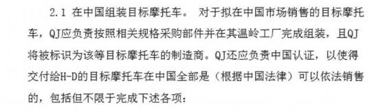 按協(xié)議,雙方將為中國和亞洲其他市場共同開發(fā)兩種不同的哈雷品牌優(yōu)質摩托車:第一款暫時定為338cc排量(以下簡稱為目標摩托車);在目標摩托車的制造和組裝以及供應鏈優(yōu)化方面進行合作;在中國和亞洲其他市場銷售和營銷目標摩托車進行合作。