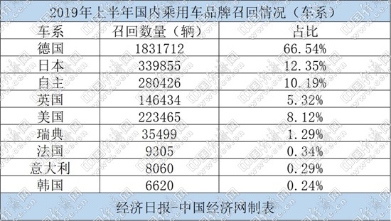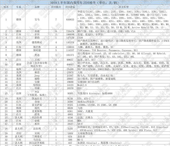 分車系來(lái)看,上半年,德系品牌成為召回“主力”,1-6月,德系品牌共召回汽車1831712輛,占召回總量的66.54%,其中寶馬、奔馳分別以830833輛和720479輛的召回?cái)?shù)量,“遙遙領(lǐng)先”其他品牌;而高檔車、超級(jí)跑車品牌保時(shí)捷更是召回汽車114337輛,數(shù)量甚至遠(yuǎn)超其2018年80108輛的銷量總和。 接下來(lái),日系品牌和自主品牌各召回汽車339855輛和280426輛,召回份額分別達(dá)到12.35%和10.19%。英系、美系、瑞典則分別召回汽車146434輛、94978輛和35499輛,占比為5.32%、3.45%和1.29%。法系、意大利和韓系召回占比則均不足1%。 聚焦至2019上半年國(guó)內(nèi)乘用車召回市場(chǎng),可謂“亮點(diǎn)不斷”。首先,從品牌角度來(lái)看,上半年國(guó)內(nèi)乘用車召回,品牌集中度很高、并多集中于高檔、進(jìn)口品牌。1-6月,寶馬和奔馳共計(jì)召回汽車1551312輛,占總量的56.35%。