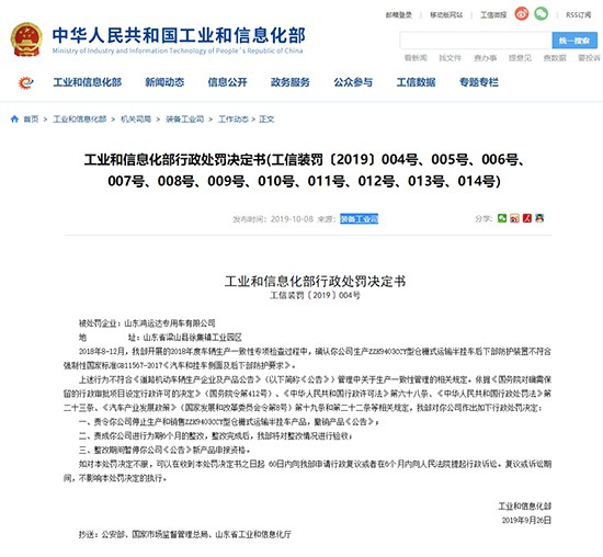經(jīng)濟日報-中國經(jīng)濟網(wǎng)10月8日訊(記者 郭躍)今日,工業(yè)和信息化部(以下簡稱“工信部”)發(fā)布公告,對11家不符合《道路機動車輛生產(chǎn)企業(yè)及產(chǎn)品公告》(以下簡稱《公告》)管理中關(guān)于生產(chǎn)一致性管理相關(guān)規(guī)定的公司進行行政處罰。處罰內(nèi)容包括停止以上11家公司生產(chǎn)和銷售違規(guī)產(chǎn)品,并撤銷產(chǎn)品《公告》;責(zé)成以上公司進行為期6個月的整改;同時,整改期間暫停公司《公告》新產(chǎn)品申報資格。