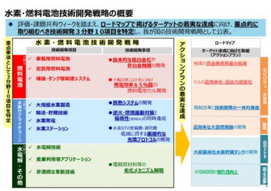 該戰(zhàn)略著眼于三大技術(shù)領(lǐng)域:燃料電池技術(shù)領(lǐng)域、氫供應(yīng)鏈領(lǐng)域和電解技術(shù)領(lǐng)域,確定了包括車載用燃料電池、定置用燃料電池、大規(guī)模制氫、水制氫等10個(gè)項(xiàng)目作為優(yōu)先領(lǐng)域,并通過(guò)互相合作來(lái)促進(jìn)技術(shù)的研究與開發(fā)。