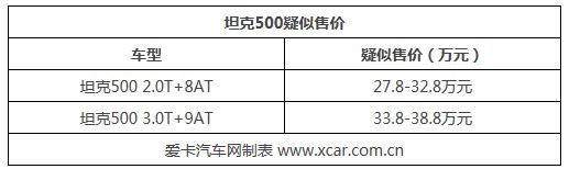 日前,我們獲悉了一組在成都車展上亮相的坦克500的疑似售價(jià),坦克500有望推出2.0T+8AT/3.0T+9AT兩種動(dòng)力車型。在價(jià)格方面,坦克500 2.0T+8AT的疑似售價(jià)為27.8-32.8萬(wàn)元,而3.0T+9AT版本則為33.8-38.8萬(wàn)元。