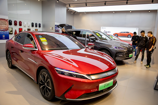 統(tǒng)計數(shù)據(jù)顯示,2021年新能源汽車產銷分別達到354.5萬輛和352.1萬輛,同比增長均為1.6倍。此外,新能源汽車市場占有率提升至13.4%,進一步說明新能源汽車市場已從政策驅動轉向市場拉動。在終端消費日漸活躍的同時,越來越多的自主品牌憑借新能源汽車闖出了一條“銷量上升、品牌向上”的新路子。圖為消費者在上海一家比亞迪店內體驗新車。視覺中國供圖