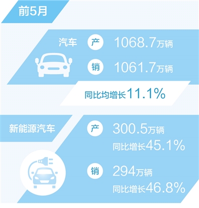 新能源汽車持續(xù)快速增長(zhǎng)。1—5月,新能源汽車產(chǎn)銷分別完成300.5萬(wàn)輛和294萬(wàn)輛,同比分別增長(zhǎng)45.1%和46.8%,市場(chǎng)占有率達(dá)到27.7%。中國(guó)汽車工業(yè)協(xié)會(huì)有關(guān)負(fù)責(zé)人表示,新能源汽車車輛購(gòu)置稅減免政策的延續(xù)和優(yōu)化,將進(jìn)一步穩(wěn)定市場(chǎng)預(yù)期,利好需求釋放。(王政)