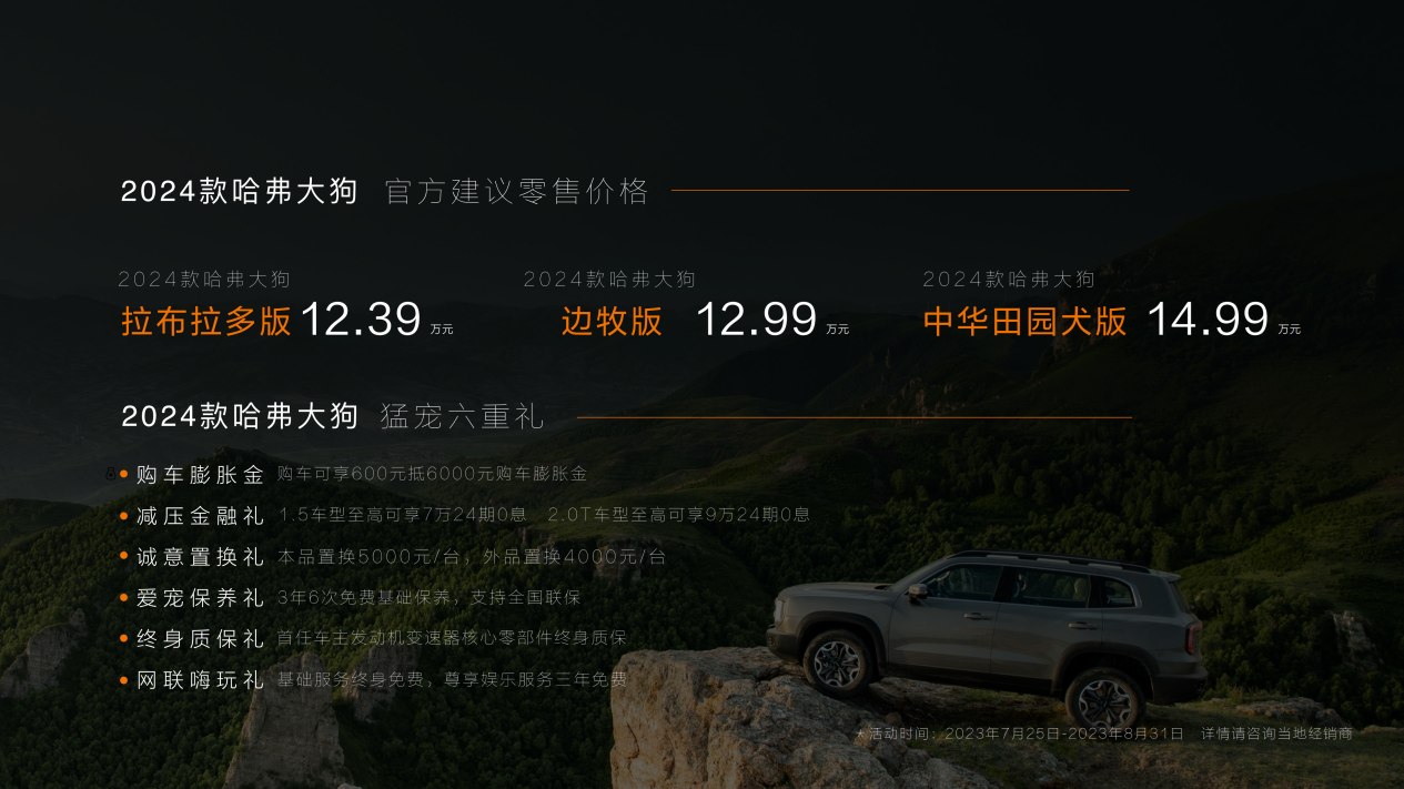 兩年前,哈弗大狗作為輕越野SUV市場(chǎng)的引領(lǐng)者,憑實(shí)力踏破市場(chǎng)包圍圈,實(shí)力領(lǐng)跑輕越野SUV賽道?,F(xiàn)如今,引領(lǐng)輕越野需求市場(chǎng)的哈弗大狗再次順應(yīng)市場(chǎng),帶來了在整體配置上全面進(jìn)階的2024款哈弗大狗,讓廣大消費(fèi)者享受到“入門即高配”的輕越野SUV。而新車也必將助力哈弗鞏固在輕越野SUV市場(chǎng)中的領(lǐng)先優(yōu)勢(shì),成為哈弗旗下又一款持續(xù)爆火的重磅產(chǎn)品!