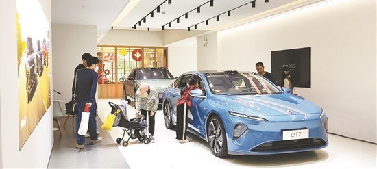 某蔚來空間體驗店內(nèi),購車者正在體驗新車