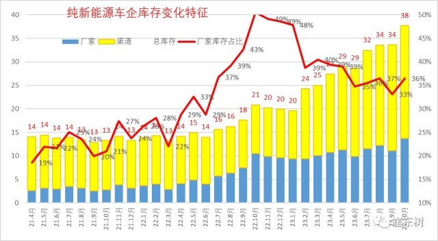 從僅生產(chǎn)新能源車的企業(yè)的庫存變化特征分析看,2023年年初庫存20萬,年初的庫存保持較好,總體新能源庫存在2月后開始持續(xù)地上升,目前上升到10月末的38萬臺水平。近期主要增長的是經(jīng)銷商庫存,這也是經(jīng)銷模式為主流進(jìn)行新能源銷售的結(jié)果。