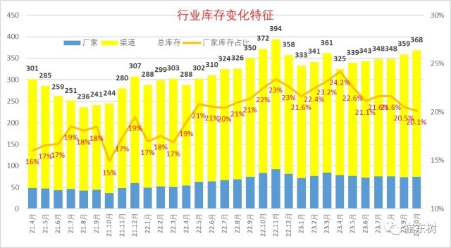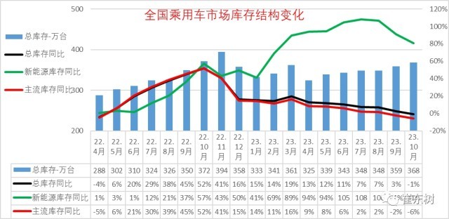 根據(jù)乘聯(lián)會的數(shù)據(jù),2023年10月月末全國乘用車庫存368萬臺,其中廠家?guī)齑?4萬臺,渠道庫存294萬臺,廠家?guī)齑嬲急?0.1%,較2022年10月下降1.9個(gè)百分點(diǎn),環(huán)比上月下降0.4個(gè)百分點(diǎn)。