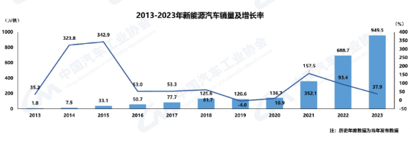 據(jù)中汽協(xié)統(tǒng)計(jì)分析,2023年我國新能源汽車產(chǎn)銷分別完成958.7萬輛和949.5萬輛,同比分別增長35.8%和37.9%,市場(chǎng)占有率達(dá)31.6%。