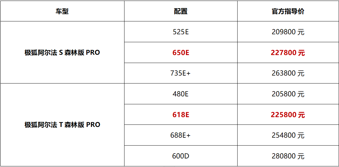 1月25日,極狐汽車旗下阿爾法S/T森林版PRO整體在原森林版基礎(chǔ)上,圍繞前后排座椅加熱/按摩、真皮方向盤、熱泵空調(diào)等豪華、舒適性配置進(jìn)行多維升級(jí),同時(shí)還新增了阿爾法S森林版PRO 650E、阿爾法T森林版PRO 618E,官方指導(dǎo)價(jià)分別為22.78萬元、22.58萬元。