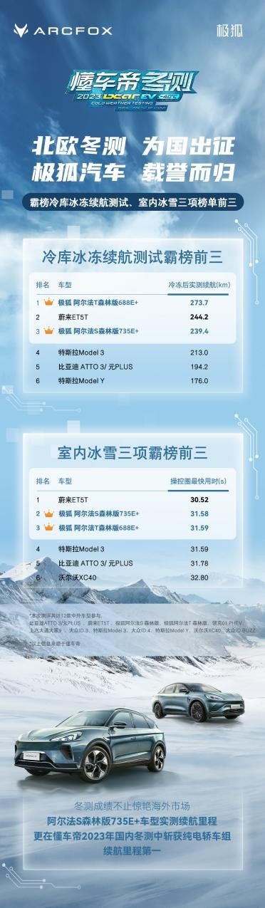 值得一提的是,就在剛剛結(jié)束的2023懂車帝冬測中,極狐汽車憑借優(yōu)異的表現(xiàn)驚艷國內(nèi)及海外市場。其中,參賽車型阿爾法S森林版735E+,以368.8的實(shí)測續(xù)航里程在國內(nèi)冬測中取得純電轎車組續(xù)航里程第一名的好成績。而阿爾法T森林版688E+、阿爾法S森林版735E+在北歐冬測中,更是以驚人的表現(xiàn),實(shí)力霸榜冷庫冰凍續(xù)航測試、室內(nèi)冰雪三項(xiàng)榜單前三,向世界展現(xiàn)了中國新能源汽車的卓越品質(zhì)。