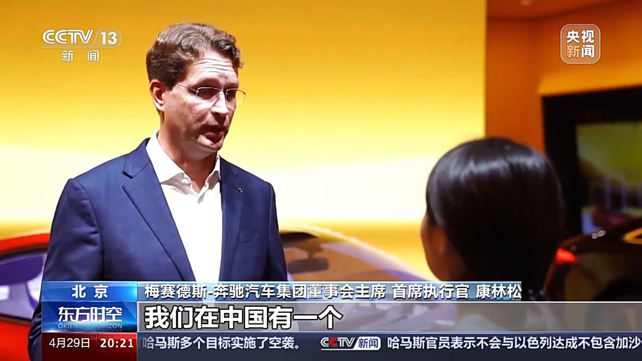梅賽德斯-奔馳汽車集團(tuán)董事會(huì)主席、首席執(zhí)行官 康林松:我們?cè)谥袊幸粋€(gè)非常全面的電動(dòng)化戰(zhàn)略。在中國,研發(fā)對(duì)我們來說變得越來越重要。(央視新聞客戶端)