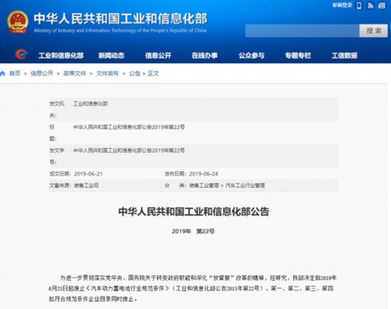 6月24日,工信部正式發(fā)布了一則公告,明確表示自今年6月21日起,廢止《汽車動力蓄電池行業(yè)規(guī)范條件》(工業(yè)和信息化部公告2015年第22號),同時(shí)廢止的還有第一、第二、第三、第四批符合規(guī)范條件企業(yè)目錄。全國乘用車市場信息聯(lián)席會秘書長崔東樹在接受《中國汽車報(bào)》記者采訪時(shí)表示,此舉意味著,在業(yè)內(nèi)存在近4年的新能源汽車動力電池“白名單”正式取消,國內(nèi)動力電池領(lǐng)域?qū)⒂瓉硇乱惠喌母偁帯?/p>