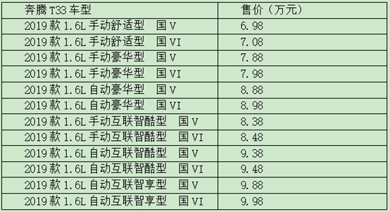 動力方面,奔騰T33搭載1.6升自然吸氣發(fā)動機最大功率為114馬力/5500rpm,峰值扭矩為155牛米/3600rpm,匹配愛信6AT變速箱。