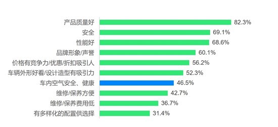 消費者前三大購車考慮因素是質(zhì)量(82.3%)、安全(69.1%)和性能(68.6%),但疫情使車內(nèi)空氣安全和健康上升成為購車時的又一考量重點(46.5%)。