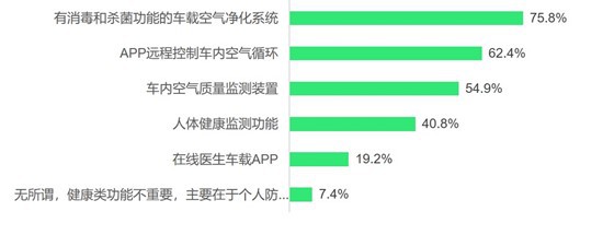 有消毒和殺菌功能的車載空氣凈化系統(tǒng)(71.9%)、APP遠程控制車內(nèi)空氣循環(huán)(65.6%)和車內(nèi)空氣質(zhì)量監(jiān)測裝置(61.3%)是意向購車者最關注的健康類功能和配置。