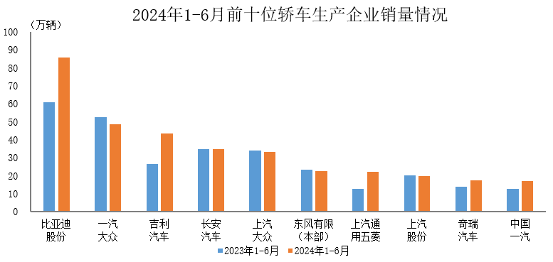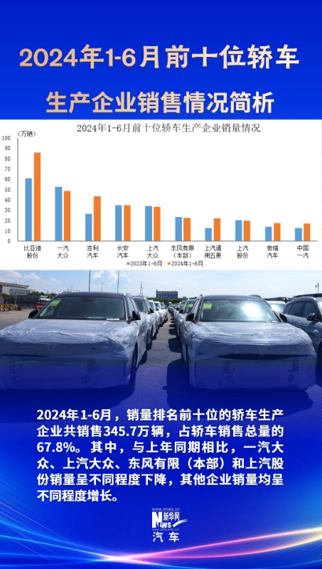 據(jù)中國(guó)汽車工業(yè)協(xié)會(huì)統(tǒng)計(jì)分析,2024年1-6月,銷量排名前十位的轎車生產(chǎn)企業(yè)共銷售345.7萬輛,占轎車銷售總量的67.8%。