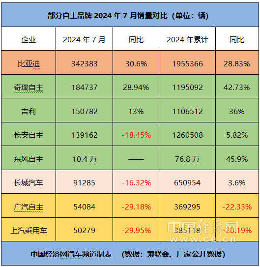 具體來看,7月,比亞迪、奇瑞自主、吉利、長安自主和長城的銷量分別為342383輛、184737輛、150782輛、139162輛、91285輛,同比分別增長30.6%、28.94%、13%、-18.45%、-16.32%;前7個月的累計銷量分別為1955366輛、1195092輛、1106512輛、1260508輛、650954輛,同比分別增長28.83%、42.73%、36%、5.82%、3.6%。