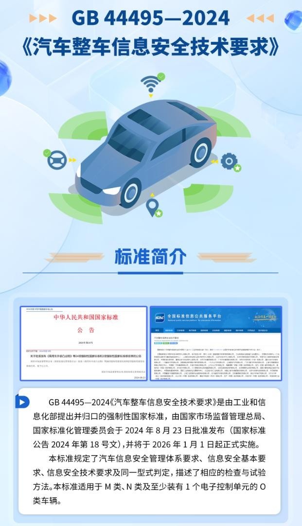 GB 44495—2024《汽車整車信息安全技術(shù)要求》規(guī)定了汽車信息安全管理體系要求,以及外部連接安全、通信安全、軟件升級安全、數(shù)據(jù)安全等方面的技術(shù)要求和試驗方法,適用于M類、N類及至少裝有1個電子控制單元的O類車輛,對于提升我國汽車產(chǎn)品的信息安全防護技術(shù)水平、強化產(chǎn)業(yè)鏈風險防范和應對網(wǎng)絡攻擊的能力、筑牢汽車信息安全防護基線具有重要意義。