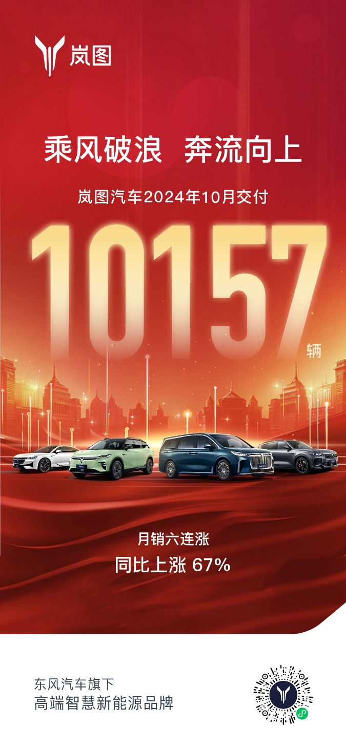 11月1日,嵐圖汽車公布2024年10月交付數(shù)據(jù)。10月,嵐圖汽車交付新車10157輛,連續(xù)兩月銷量破萬,1-10月,嵐圖汽車累計交付62705輛,同比增長87%。面對激烈市場競爭,嵐圖汽車以強大體系力破局,發(fā)揮自主創(chuàng)新的強大勢能,月銷實現(xiàn)“六連漲”。
