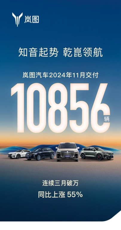 12月1日,嵐圖汽車公布2024年11月交付數(shù)據(jù)。11月,嵐圖汽車交付量攀升至10856輛,同比增長(zhǎng)55%,連續(xù)三個(gè)月躋身“萬輛俱樂部”。1-11月,嵐圖汽車?yán)塾?jì)交付73561輛,同比增長(zhǎng)81%。背靠東風(fēng)集團(tuán)55年的造車功底,再加上極其“聽勸”的態(tài)度,嵐圖汽車迎來銷量“七連漲”,成為高端新能源國(guó)家隊(duì)名副其實(shí)的優(yōu)等生和領(lǐng)跑者。