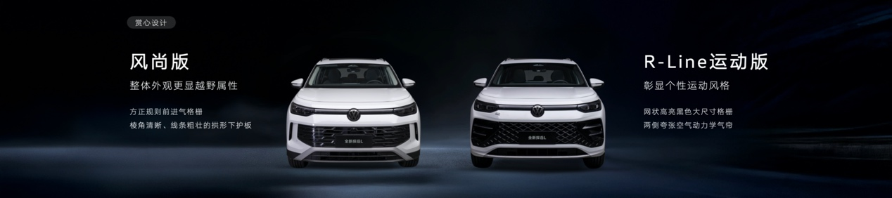 外觀造型上,為滿足當(dāng)下用戶多元化的審美需求,全新探岳L提供兩種前臉設(shè)計。其中,風(fēng)尚版車型的前臉方正且規(guī)則的進(jìn)氣格柵,輔以棱角清晰、線條粗壯的拱形下護(hù)板,整體外觀更顯越野屬性。相比之下,R-Line運(yùn)動版則采用了品牌標(biāo)志性的網(wǎng)狀、高亮黑、大尺寸格柵,與兩側(cè)夸張的空氣動力學(xué)氣簾相得益彰,賦予車輛更凌厲氣質(zhì),充分彰顯個性運(yùn)動風(fēng)格。