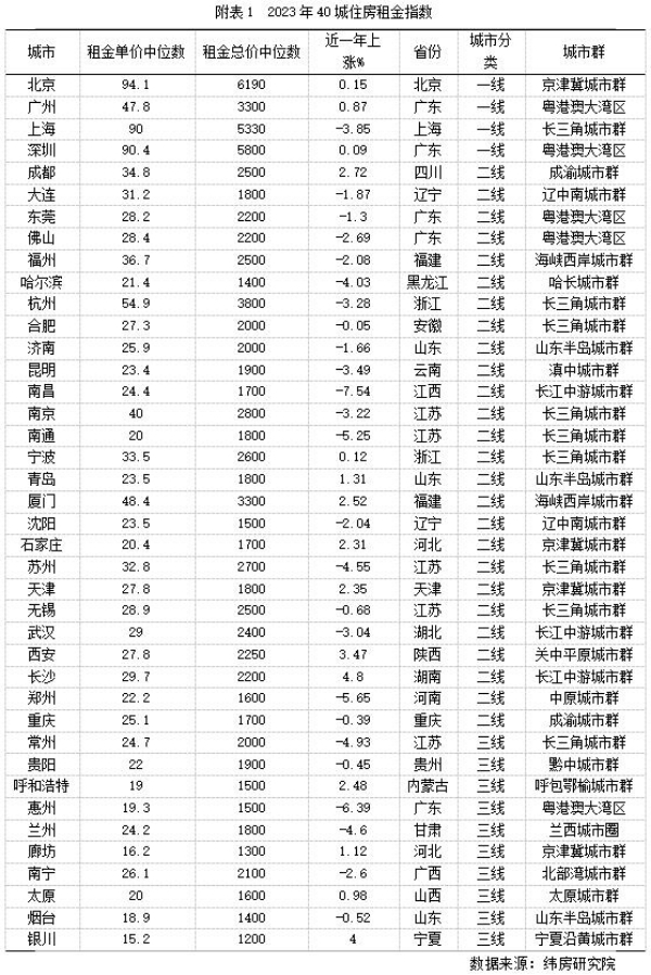 從漲跌結(jié)構(gòu)看,緯房研究院數(shù)據(jù)顯示,2023年重點(diǎn)40城中有15個(gè)城市住房租金同比上漲,其余25個(gè)城市住房租金同比下降。住房租金上漲的城市中,7個(gè)城市漲幅在2%以內(nèi),8個(gè)城市漲幅超過2%;住房租金下跌的城市中,8個(gè)城市跌幅在2%以內(nèi),9個(gè)城市跌幅在2-4%;8個(gè)城市跌幅超過4%。