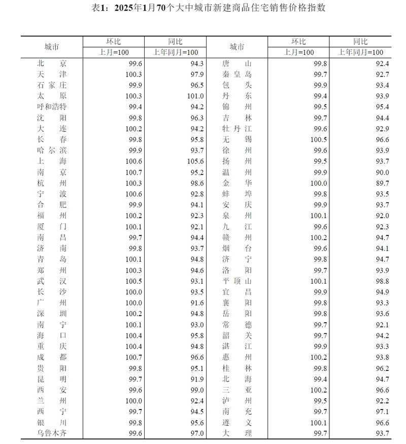 國家統(tǒng)計(jì)局城市司首席統(tǒng)計(jì)師王中華解讀稱:“2025年1月份,70個(gè)大中城市中,一線城市商品住宅銷售價(jià)格環(huán)比繼續(xù)上漲,二三線城市環(huán)比總體略降;一二三線城市同比降幅均持續(xù)收窄?!?/p>