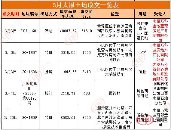 3月份,太原共5宗用地成交,除南沙河南岸一宗商住用地被太原龍城南部置業(yè)有限公司摘得以及一宗國(guó)有土地使用權(quán)轉(zhuǎn)讓以外,其余3宗均被萬科摘得,成為本月土地市場(chǎng)的最大看點(diǎn)。