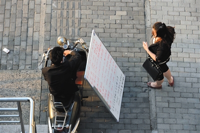 2013年10月14日,一位市民在看房產(chǎn)中介放置于上海自由貿(mào)易試驗(yàn)區(qū)二號(hào)門附近的房源信息。圖/視覺(jué)中國(guó)