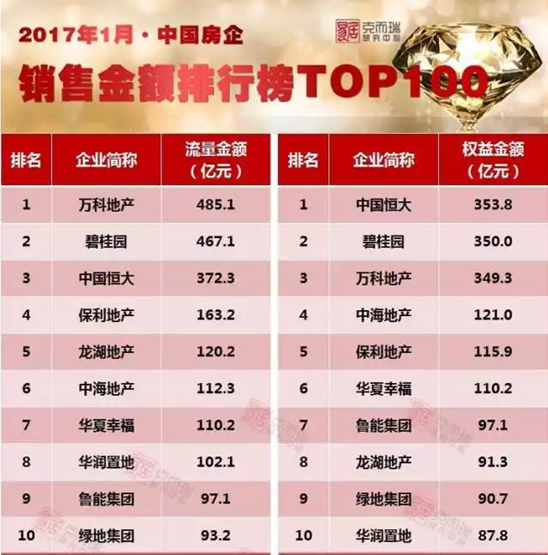 2017年1月中國(guó)房前銷售金額排行榜前十(來源:克而瑞研究中心)