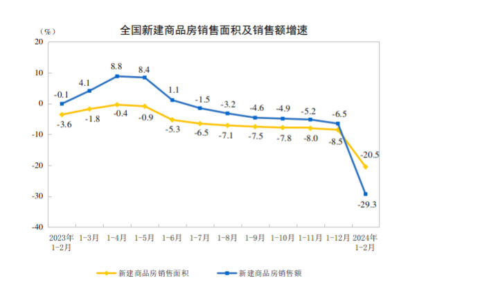國家統(tǒng)計(jì)局?jǐn)?shù)據(jù)顯示,1-2月全國房地產(chǎn)開發(fā)投資累計(jì)同比繼續(xù)下降,但降幅相比于2023年全年有所收窄。