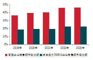 報(bào)告顯示,2023年,百強(qiáng)企業(yè)銷售總額、銷售面積分別達(dá)53896.0億元、26131.6萬平方米。 百強(qiáng)企業(yè)市場份額為46.2%,較上年微增0.4個百分點(diǎn)。