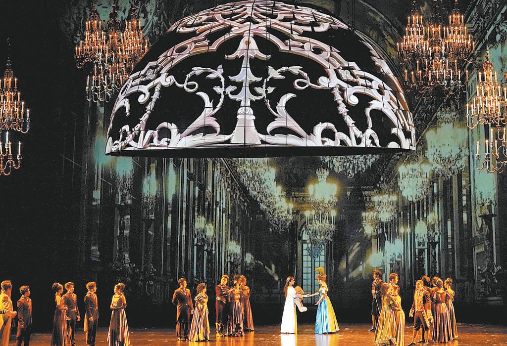 與壯闊宏大的作品立意相匹配的,是當(dāng)?shù)闷鹑A美二字的舞臺呈現(xiàn)。璀璨的吊燈、長長的樓梯等鮮明意象不斷出現(xiàn),簡潔的布景與流動的影像虛實(shí)交織,把輝煌的宮廷、幽靜的鄉(xiāng)村、無垠的星空等場景營造得深邃動人。其中,由多塊LED屏拼成的圓弧最引人注目,在舞美設(shè)計(jì)維亞切斯拉夫·奧庫涅夫的解讀中,和平的寧靜短暫降臨時,圓弧可以隨影像變幻為宮殿穹頂、簡潔的花園涼亭,為生活遮風(fēng)擋雨;戰(zhàn)爭襲來,刺目的紅光從破裂崩碎的圓弧中迸濺而出,恰如滿目瘡痍、生靈涂炭的現(xiàn)實(shí)。最終,幾瓣圓弧拼成碧水青山的“地球”,呼應(yīng)原著小說標(biāo)題中的俄語單詞“Mip”,即“世界”,將作品的意境再次推上新的高點(diǎn)。