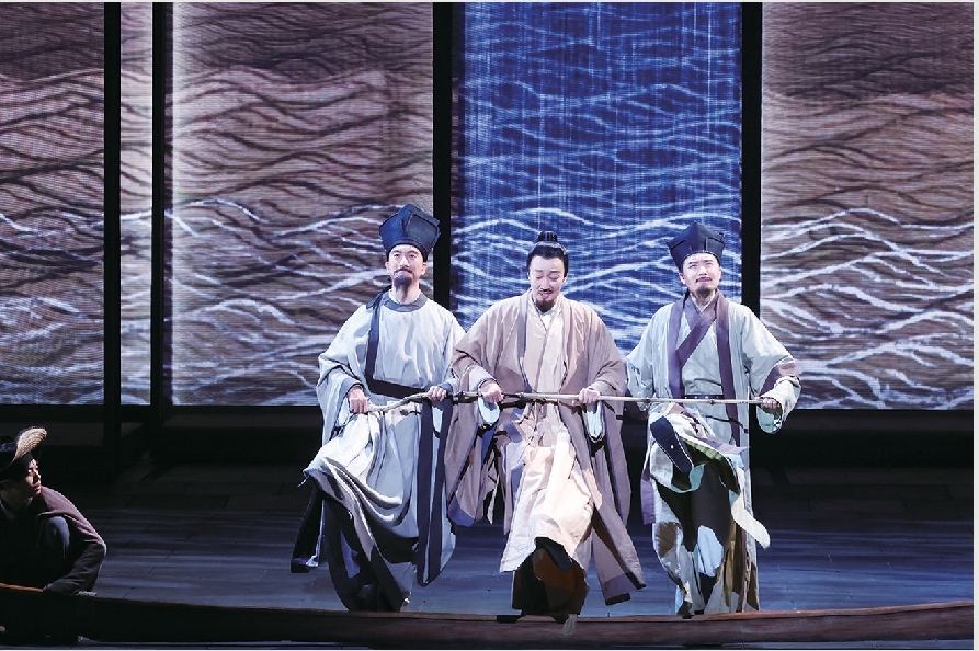 記者:舞臺上有一場戲堪稱絕妙:一葉扁舟上,蘇軾、王安石、司馬光三人上演的“盜夢空間”式“跨越時空”的對話,比如處理水患災(zāi)情時,蘇軾要召開新聞發(fā)布會,甚至說要開直播……這些看似隨意甚至荒唐的表達和演繹,給觀眾帶來一種新鮮的、自由開放的演劇體驗觀。劇中有借鑒中國戲曲中的可變性、流動性、空間結(jié)構(gòu),也有借鑒西方戲劇的多種技巧,這樣非線性、開放式敘事結(jié)構(gòu),有著怎樣的匠心?
