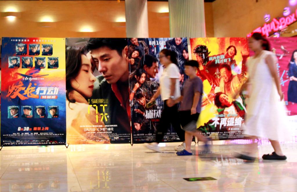 8月30日,在山東省臨沂市平邑縣時代國際影城,觀眾從電影宣傳海報前走過。新華社發(fā) (武紀全攝)
