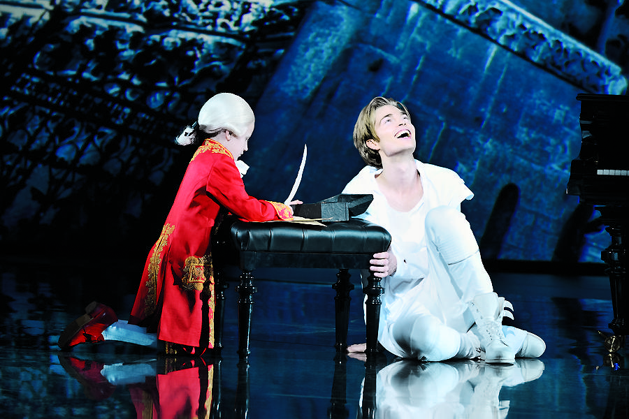 《莫扎特!》里的“另一個(gè)自我”卻不一樣,這個(gè)默默的小莫扎特既貫穿始終,又十分乖巧,基本上不去打擾主人公,絲毫不在聲音上影響這部歌曲極密的音樂(lè)劇的呈現(xiàn),卻能給觀眾留下更難以磨滅的印象?!澳男∧亍北緛?lái)可能只是主創(chuàng)不得已采用的辦法,因?yàn)閮和輪T不大可能每晚演出,經(jīng)常要換人——上海的演出就是請(qǐng)了上海的孩子,很難要他們說(shuō)或唱復(fù)雜的臺(tái)詞和唱段,所以干脆讓他們演啞劇。這個(gè)辦法似乎歪打正著,反而產(chǎn)生了舞臺(tái)上最好的效果。