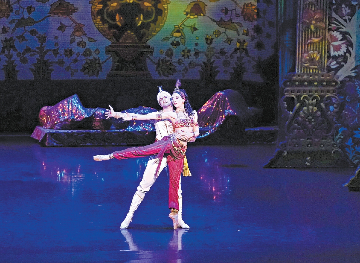 故事在富麗堂皇的宮殿中開啟,典雅繁復的梁柱、燦如繁星的燈盞幽邃美麗,夢幻得令人驚嘆。連續(xù)3天,兩位首席舞者安娜·薩莫斯特列洛娃、伊琳娜·薩波日尼科娃與第一獨舞拉達·薩爾塔科娃各自領銜的3組演員陣容輪番上場,舞動著這部作品的波折壯麗。同時,阿塞拜疆民族作曲家菲克列特·阿羅米夫為《一千零一夜》所作的配樂耐人尋味,他將東方旋律與歐洲古典形式交織,大量運用邦戈鼓、大鑼、木琴、顫音琴等打擊樂器,并加入了阿塞拜疆傳統(tǒng)弦樂器塔爾琴。在阿尤布·古利耶夫的帶領下,中央芭蕾舞團交響樂團的現(xiàn)場演奏極具戲劇張力和沖擊感,為整臺演出鋪陳了瑰麗磅礴的底色。