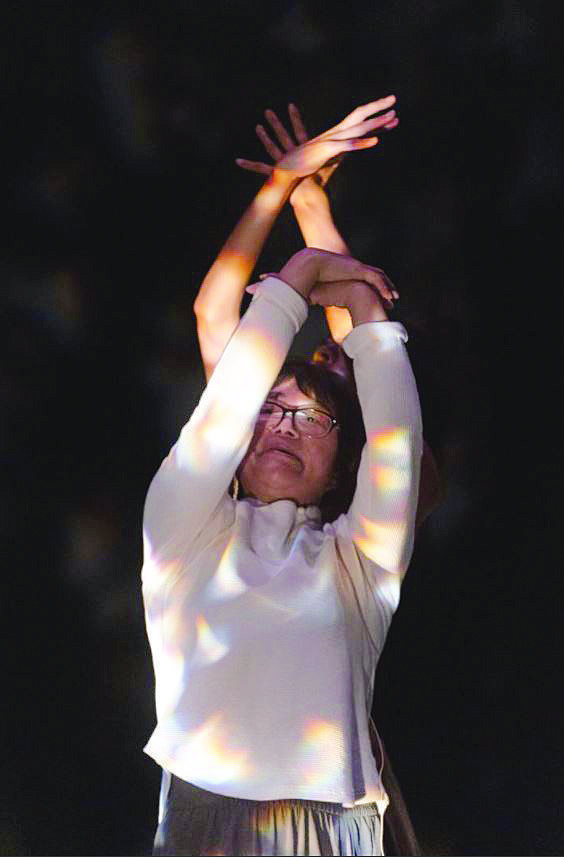 于是在《萬噸月色》的編排中,有兩名專業(yè)舞者圍繞著余秀華,她們分別隱喻著光明和陰影的意象,處在光明中的舞者美麗無瑕、人人向往,隱在陰暗中的舞者幽深難測、焦慮不安。這是對余秀華的內心世界和她的詩歌意象的直觀再現:這個傲視世俗偏見的詩人,也曾困惑于“他人的眼光”,她曾渴望光亮,害怕墜入暗淡,恰似她手持玫瑰登場,但這些花束變成砸向她的武器,而她的勇敢在于,在承受過偏見與傷害之后,她放下了“被認可”的執(zhí)念,擁抱不完美的自己,自我和解。
