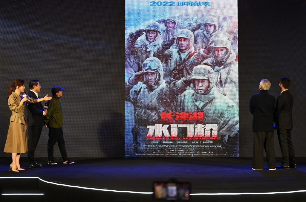 電影《長津湖之水門橋》2021年在廈門舉行新聞發(fā)布會,黃建新(左三)為總監(jiān)制。新華社記者 林善傳 攝