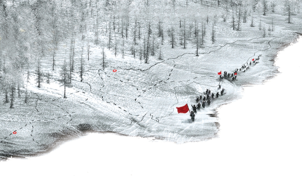 每年很長時間,這里的氣候不適合室外生存,冬季氣溫更低至零下三四十度,有人的耳朵、手指、腳趾甚至?xí)粌龅簟H哲妼?dāng)?shù)卮迕駨?qiáng)制集中居住,抗聯(lián)得不到食物、衣服等。正如《歸隊》中所呈現(xiàn)出來的那樣:戰(zhàn)士們輕易不能生火取暖,深可沒腰的積雪限制了我方移動,行蹤又很容易被發(fā)現(xiàn)——敵人會沿著雪地上的腳印,進(jìn)行追擊。