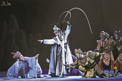 此外,該劇還利用舞臺技術(shù)突破了傳統(tǒng)戲曲的節(jié)奏,使之更為緊湊連貫。比如白骨精定下計謀要去偵探唐僧情況時,舞臺光暗,一個發(fā)光小球飛升直達天幕,暗示白骨精元神飛出洞府,同時伴有類似影視音效作為烘托;而在唐僧狠心驅(qū)逐孫悟空時,孫悟空向八戒沙僧交代完后,從上場門下場,后場馬上就安排一個孫悟空替身吊威亞從上場口飛到下場口,過程連貫自然,這都是受到電影藝術(shù)啟發(fā)的創(chuàng)新。