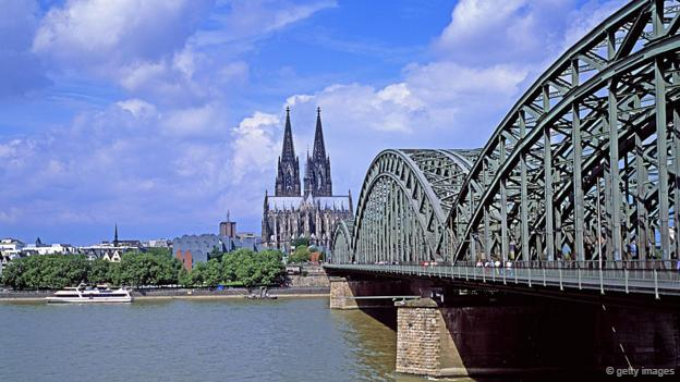 2科隆霍亨索倫橋 科隆霍亨索倫橋始建于第一次世界大戰(zhàn)前,該橋設計獨特,體現(xiàn)了當時石材工程與鋼鐵結構的完美結合。大橋于1911年完工,橋長共409米,橫跨萊茵河。1945年3月,為了減緩盟軍向柏林行進的速度,橋梁被德軍炸毀?,F(xiàn)在該橋已被成功修繕并成為德國最繁忙的鐵路線路。橋上的鋼鐵結構形似鯨魚的脊背,柵欄上掛滿了情侶們的“愛情鎖”。如今這座橋已經(jīng)成為團結和愛的象征。