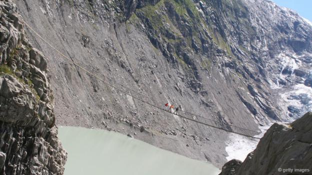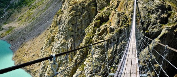 5特里夫特懸索橋 在所有懸索橋中,最令人驚心動魄的應該就是特里夫特懸索橋了。該橋長170米,跨伯爾尼高地的特里夫特斯湖,湖面與橋之間無任何連接,湖光山色冰川美景盡收眼底,每年吸引著成千上萬名渡橋者前來游覽。