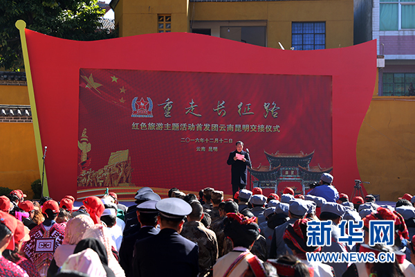 “重走長(zhǎng)征路”紅色旅游主題活動(dòng)首發(fā)團(tuán)云南昆明交旗儀式現(xiàn)場(chǎng)。