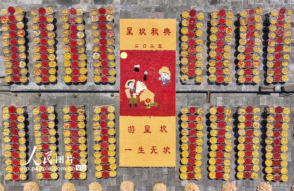 2025年8月18日,安徽省黃山市徽州區(qū)呈坎古村迎來(lái)了一年一度的“曬秋”盛景,村民們趁著晴好天氣,將豐收歸倉(cāng)的玉米、南瓜、紅辣椒等農(nóng)作物鋪滿曬場(chǎng),五彩斑斕的農(nóng)作物與徽派古建交相輝映,構(gòu)成一幅五谷豐登的秋收畫(huà)卷,吸引眾多游客前來(lái)感受豐收的喜悅。施亞磊攝(人民圖片網(wǎng))