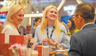 在中國展區(qū),兩名英國參展商一邊品茶,一邊與中國旅游企業(yè)代表交流。本報記者 許立群攝