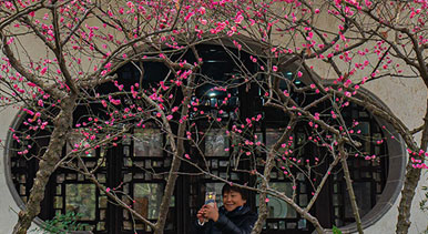近日,上海青浦區(qū)曲水園內(nèi),紅梅、白梅、蠟梅競(jìng)相綻放,吸引眾多市民前來(lái)賞花。王初攝(人民圖片網(wǎng))