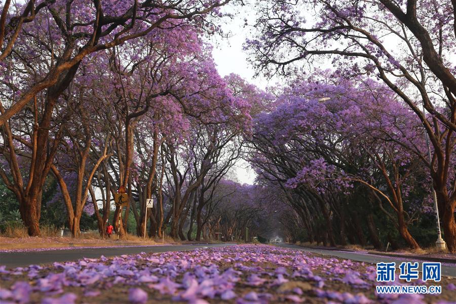 在津巴布韋首都哈拉雷,隨處盛開的藍花楹成為靚麗的風景(10月2日攝)。 近日,位于非洲南部的津巴布韋進入春季,全國各地的藍花楹紛紛盛開。津巴布韋風光秀麗,擁有維多利亞瀑布、大津巴布韋遺址等5處世界自然或文化遺產。首都哈拉雷有多處神奇的平衡石景觀,同時也因出色的園藝被稱為非洲“花城”。新華社發(fā)(陳雅琴攝)